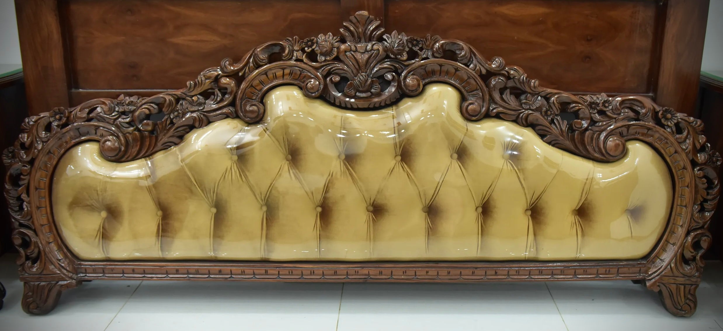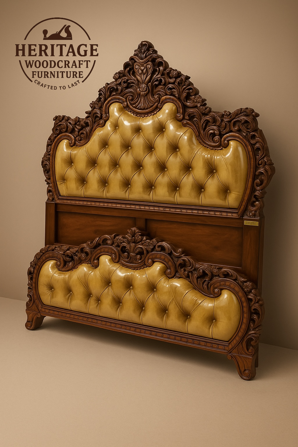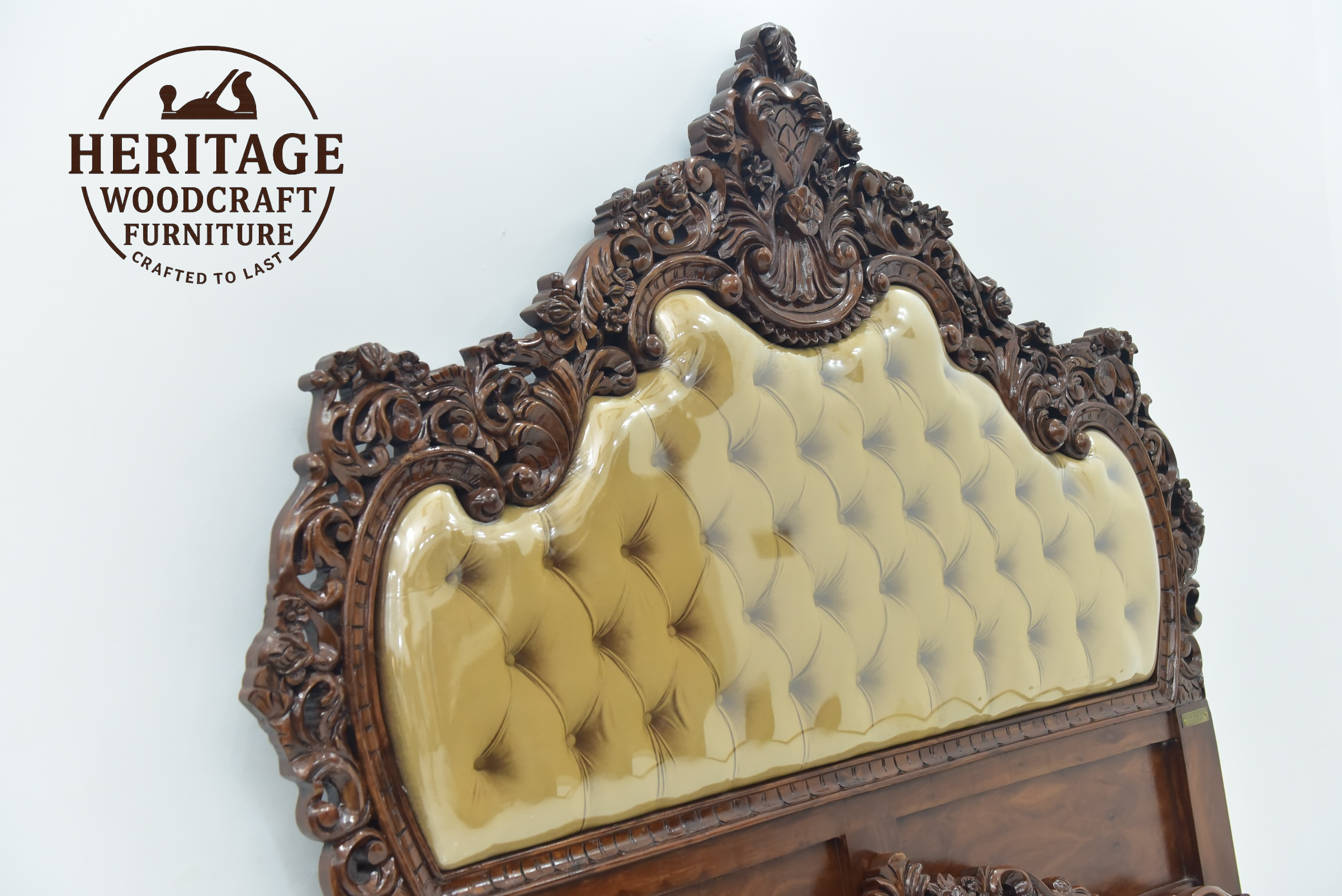 The headboard and footboard feature intricate, deep carvings crafted by master artisans—each