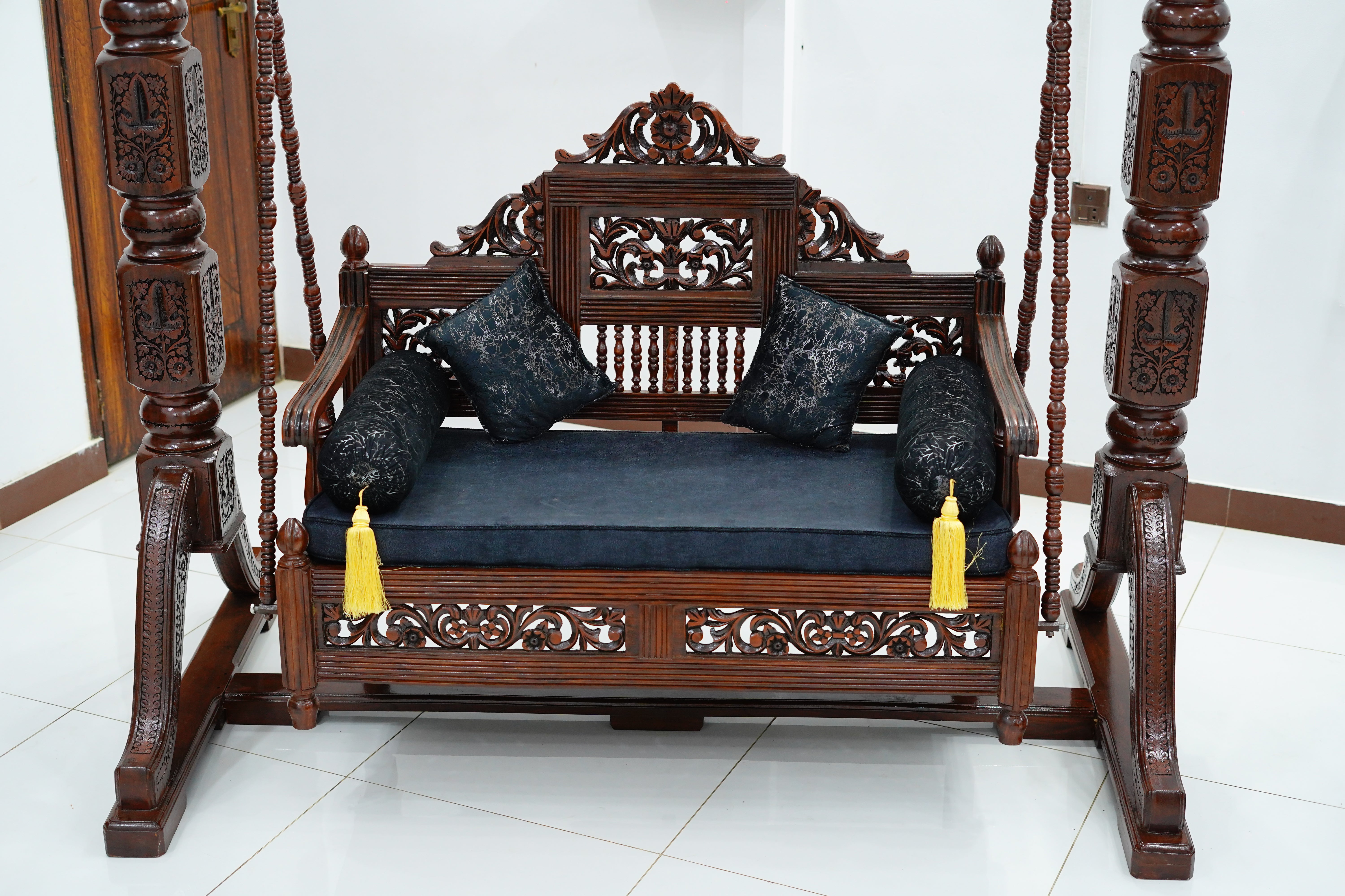 Add a touch of luxury and tradition to your home with this exquisitely handcrafted wooden swing.