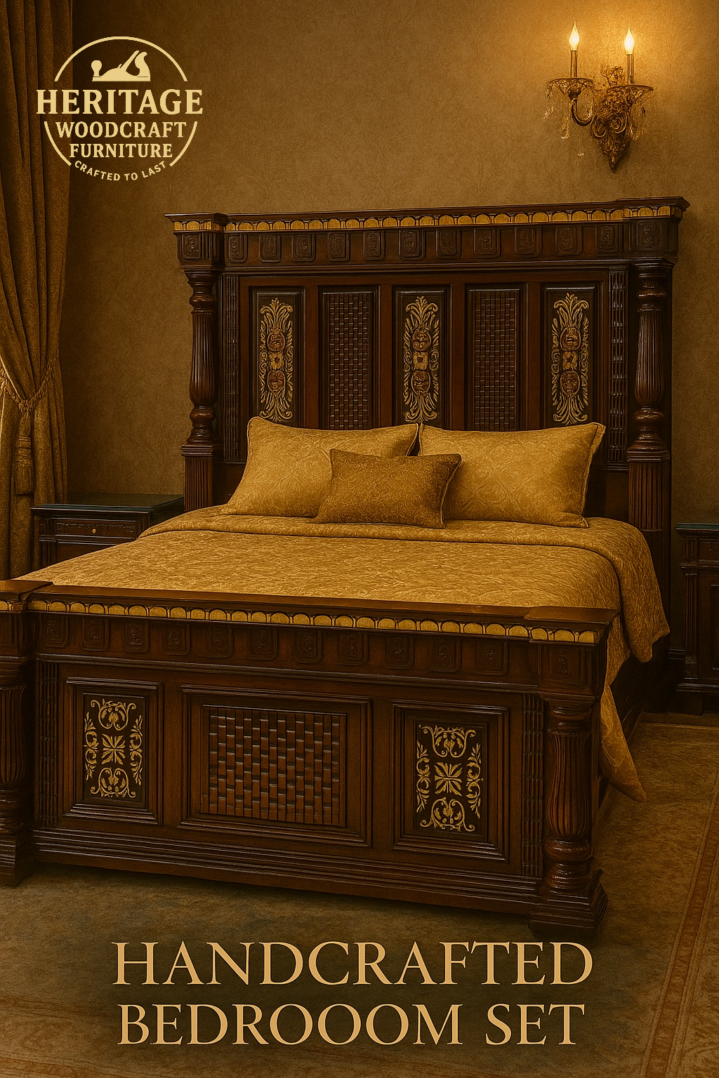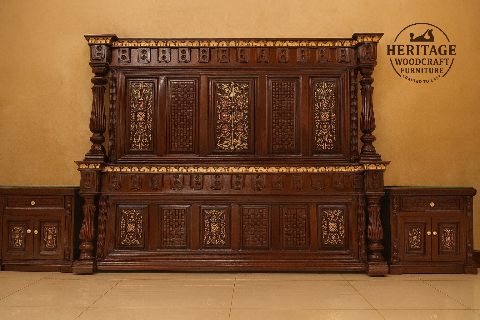 The headboard and footboard feature intricate, deep carvings crafted by master artisans—each