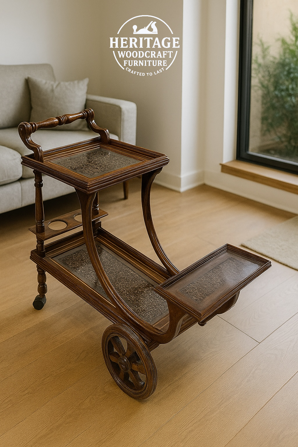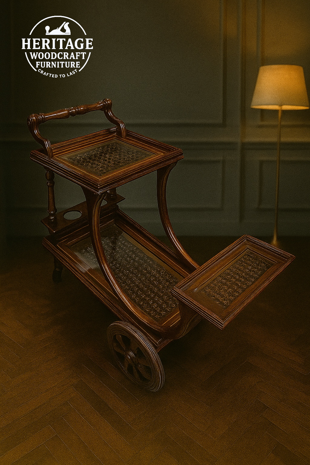 A beautifully handcrafted solid wood serving trolley, designed with classic curves and elegant